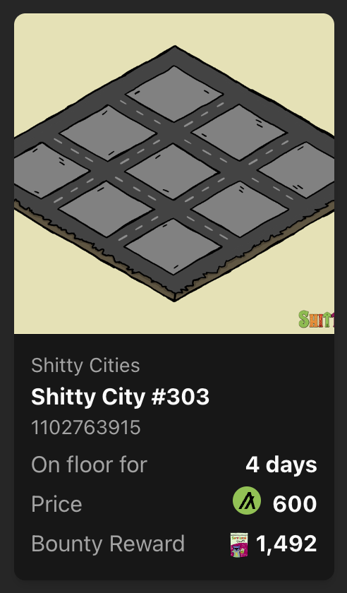 <figure><img src="https://2666435871-files.gitbook.io/~/files/v0/b/gitbook-x-prod.appspot.com/o/spaces%2FktbhI1CAoVzzqR3aixMp%2Fuploads%2FvfniIkgFUkuzAzojkQ88%2FCleanShot%202024-04-04%20at%2014.42.43%402x.png?alt=media&#x26;token=b75e2fa1-daa0-4d83-8604-9c0a2ffb98ef" alt="" width="246"><figcaption><p>This Shitty Bounty has a reward of 1,492 Shitty Treats because of its price and the amount of time it's been on the floor.</p></figcaption></figure>